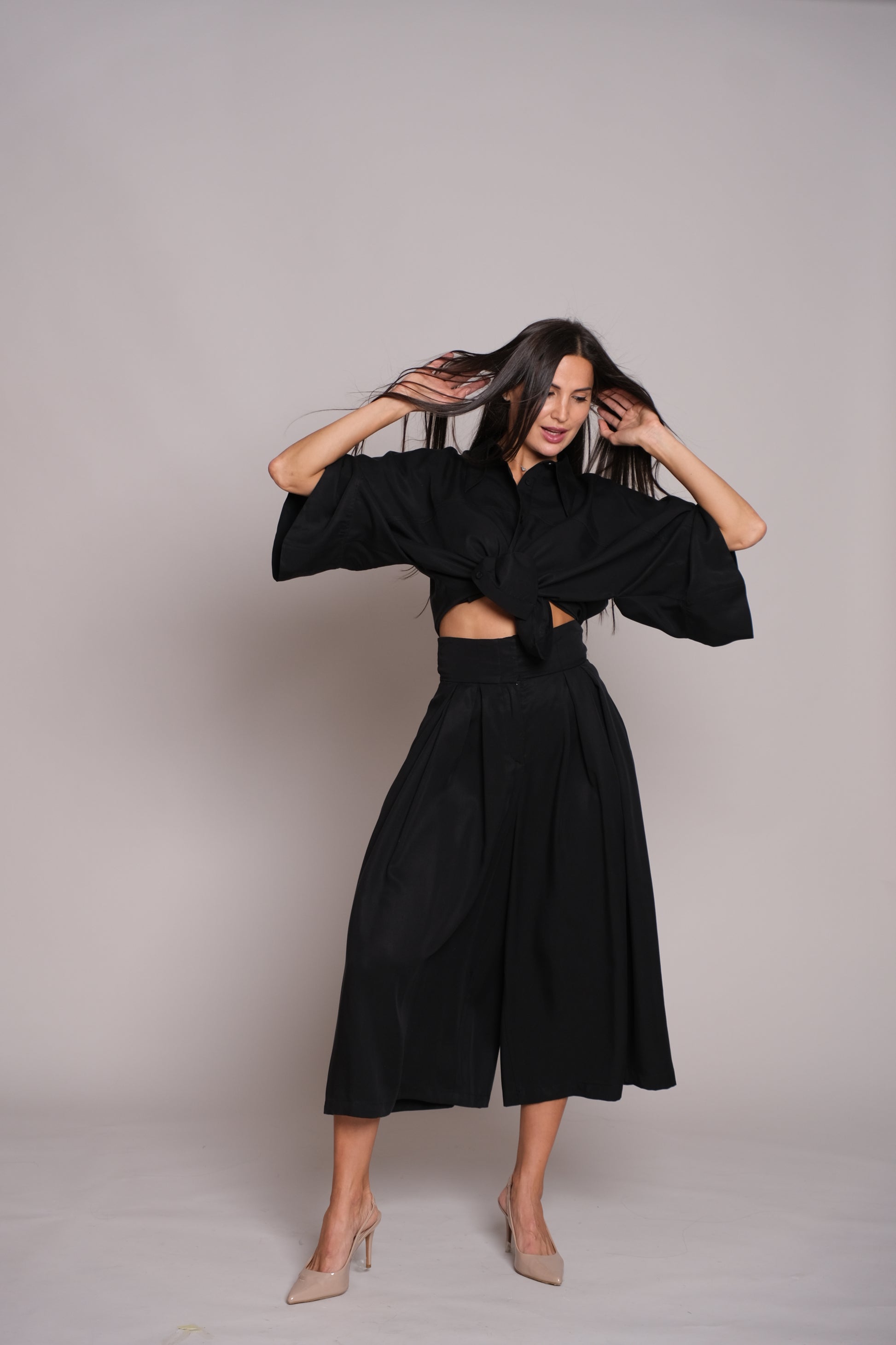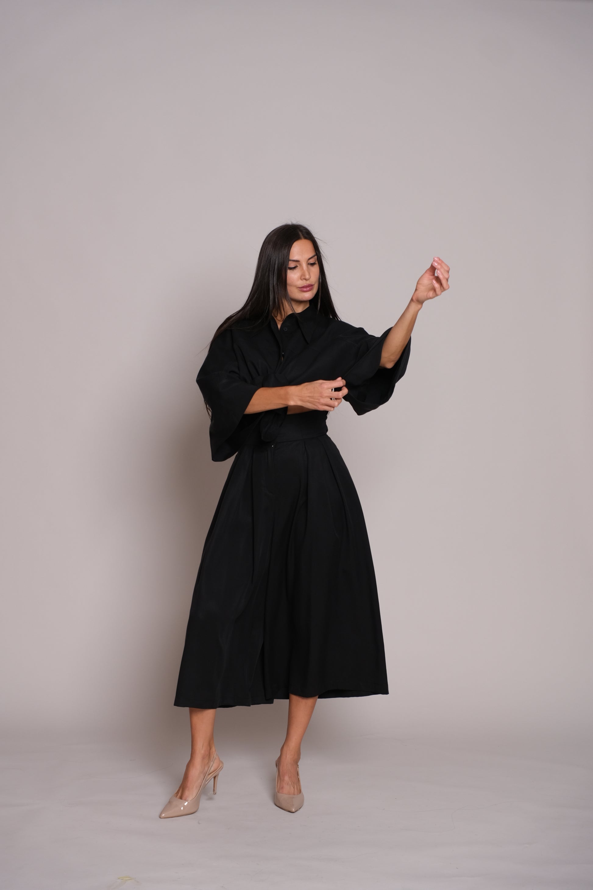 Открийте непринудена елегантност с Kimono Shirt Black. Дизайнът на ризата с широки ръкави и свободна кройка съчетава комфорт с изискана елегантност. Изработена от мека, лека материя, тя красиво драпира, правейки я перфектна както за ежедневни, така и за елегантни вечерни тоалети. Съчетайте я с нашите Flair Trousers Black за монохромен ефект или я комбинирайте с джинси за модерен привкус.
