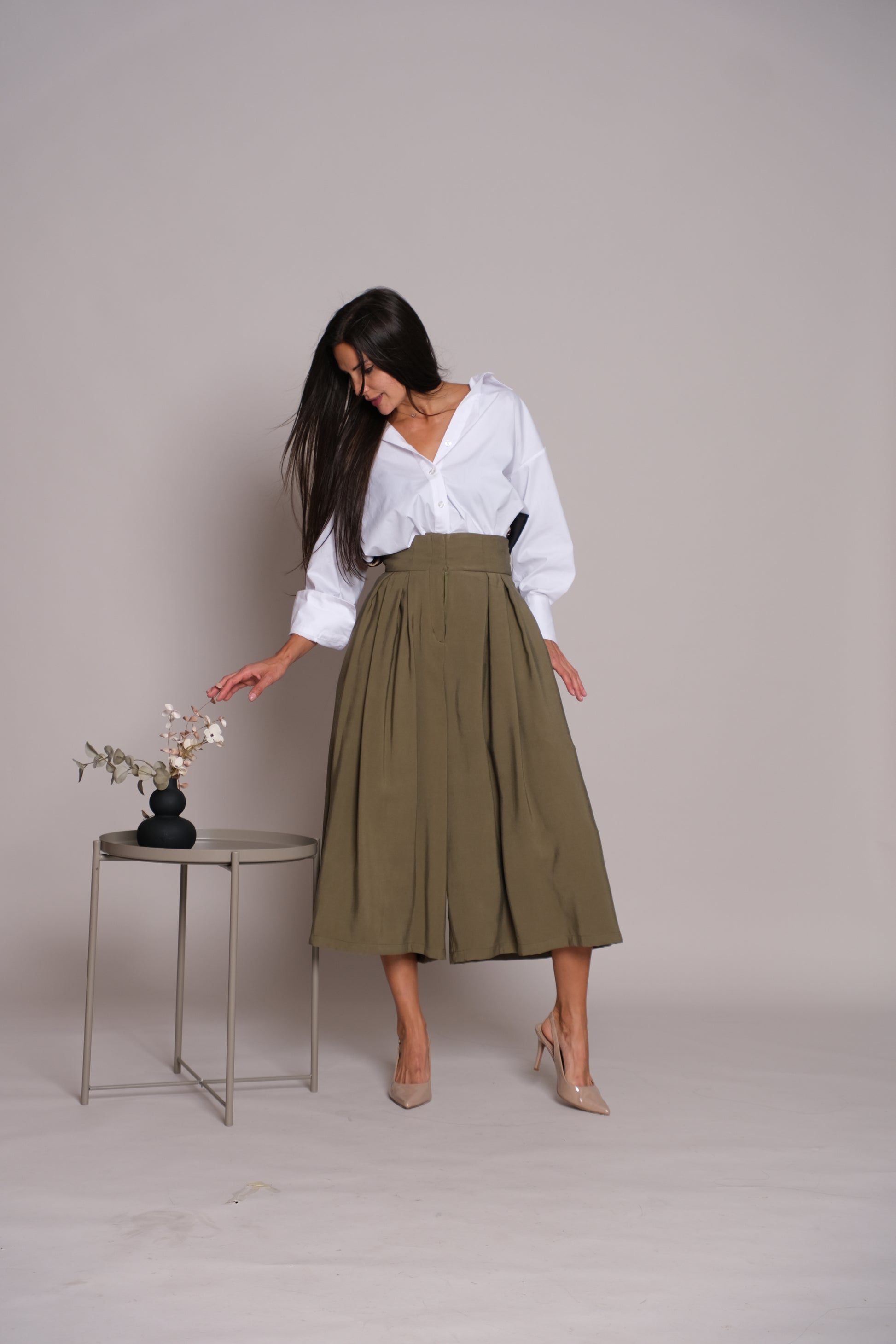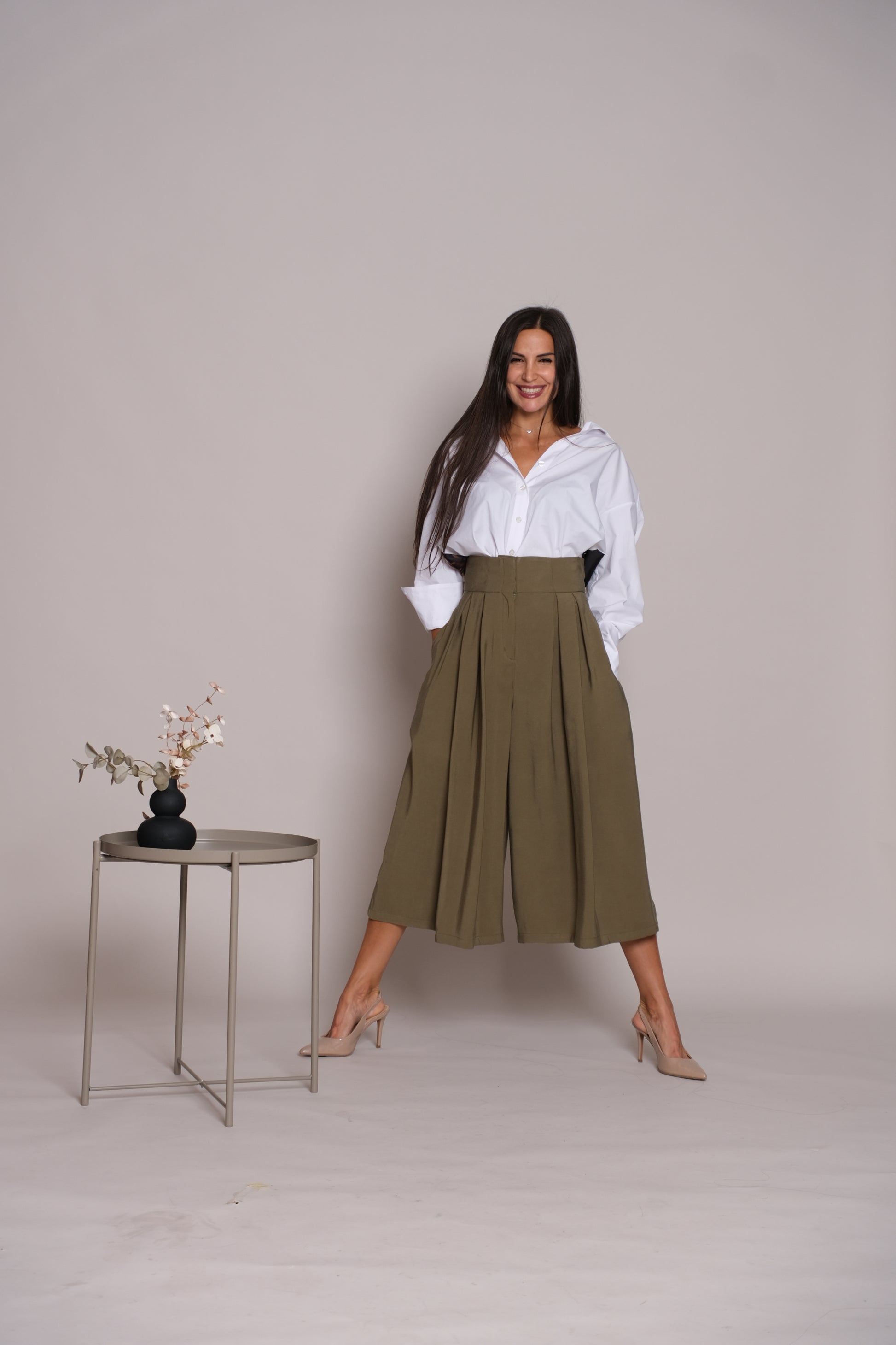 Преоткрийте елегантността с Flair Trousers Olive . С висока талия и широки крачоли, те са изработени в стил, напомнящ кюлоти, предлагайки грациозния вид на пола с комфорта на панталони. Мекият бежов цвят ги прави изключително универсални – идеални за офисен шик, съботно-неделен отдих или изискани вечери.