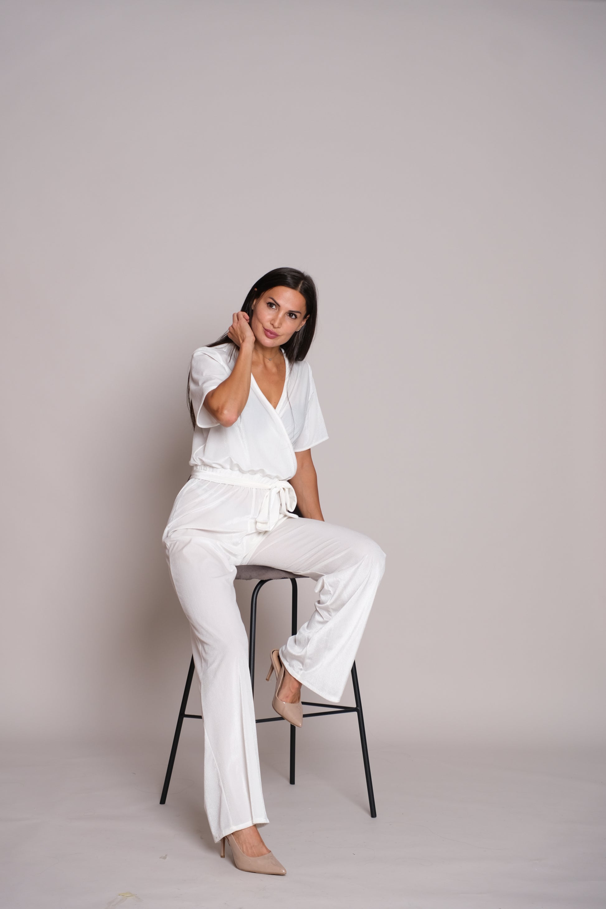 Преоткрийте нежната елегантност с Velora Jumpsuit Pure White. С дълбоко деколте и плавна, изящна линия, той излъчва едновременно увереност и стил. Коланът, който се връзва отпред, подчертава талията и придава форма на свободната кройка. В класическо бяло, гащеризонът съчетава изтънченост и съвременен чар – идеален за вечерни излизания, специални поводи или стилна дневна визия.
