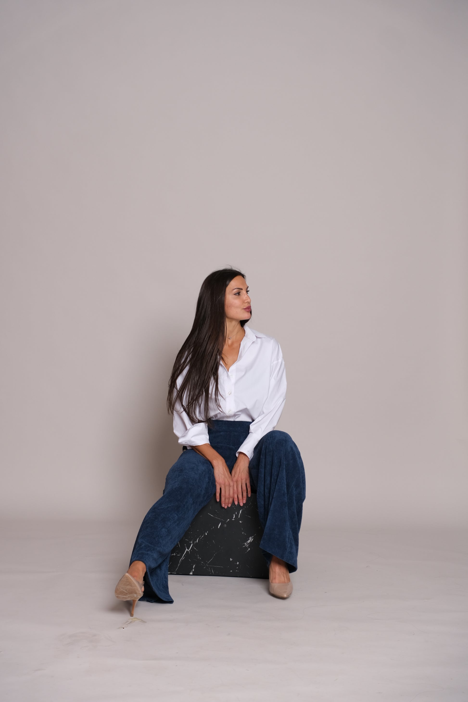 Вдъхнете си изисканост с Velvet Blue Skyline Trousers. С висока талия и свободна кройка с широки крачоли, те създават удължен и елегантен силует, като същевременно осигуряват удобство за ежедневието. Отличителните копчета от двете страни на талията добавят изтънчен акцент, превръщайки панталона от базов в стилно изявление. В наситения кадифено син нюанс, той преминава без усилие от професионална визия към вечерна елегантност.
