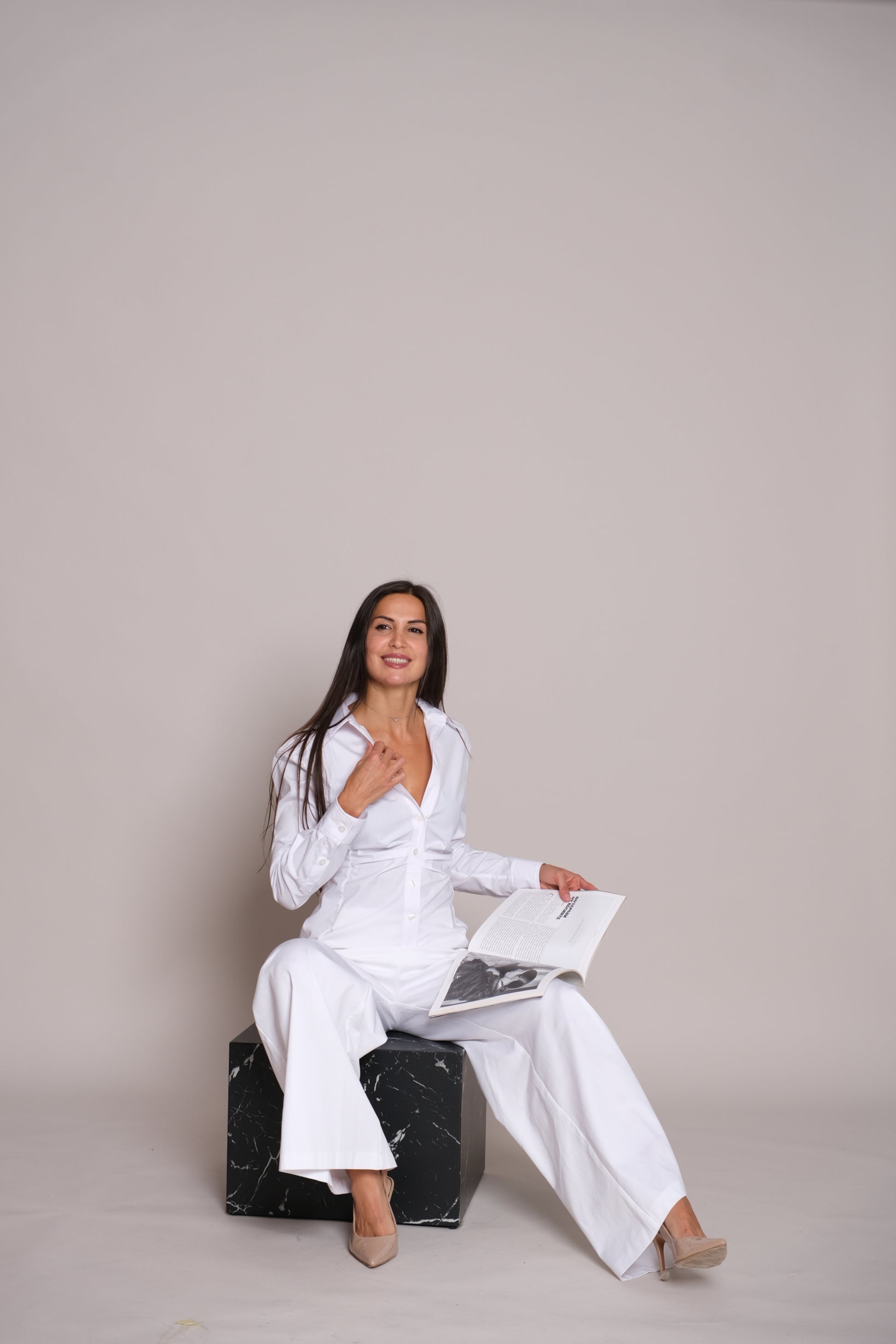 Издигнете гардероба си с вечната елегантност на ризата Sun Shirt White. Изработена в изчистено бяло, тя впечатлява с елегантно V-образно деколте, което издължава силуета и носи нотка изисканост. Прибраната талия подчертава женствената линия, съчетавайки прецизна кройка с нежни форми. Непринудено стилна и универсална, тази риза преминава без усилие от делова визия към вечерна елегантност.
