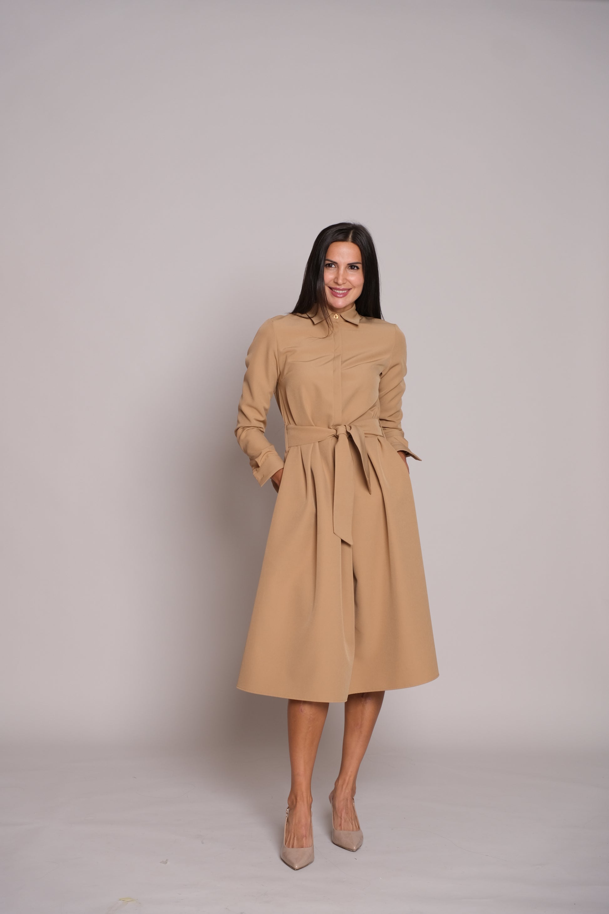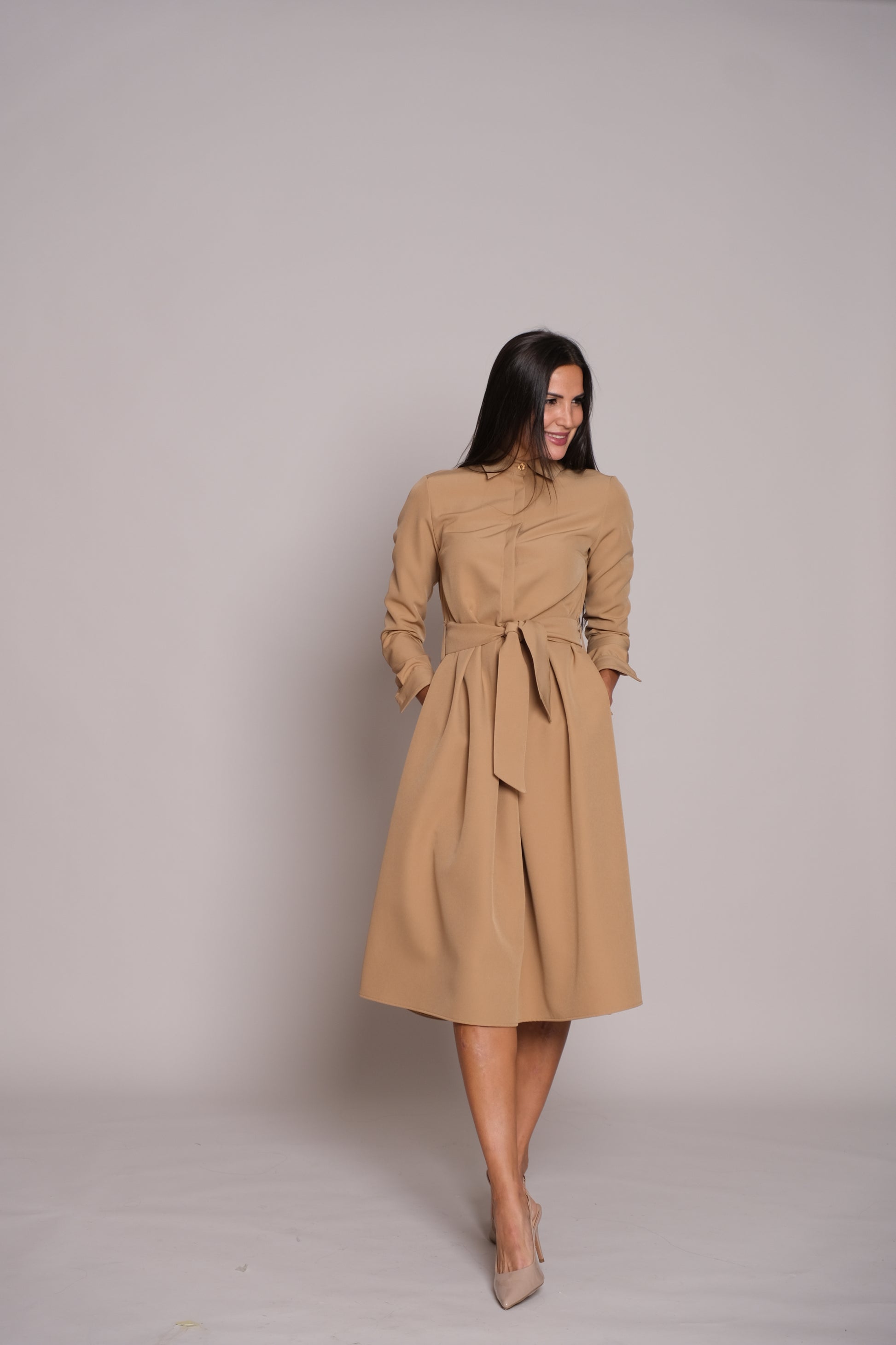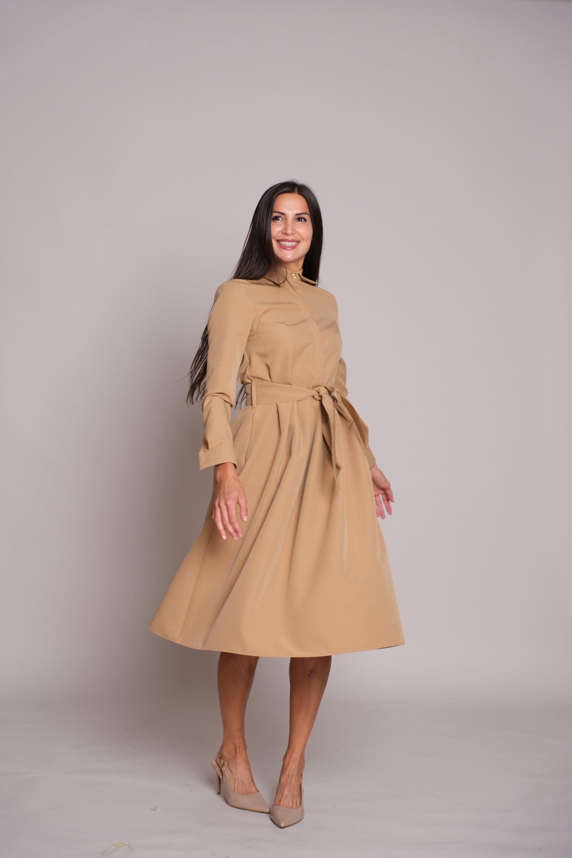 Elevate your style with the Aveline Dress Beige. Falling gracefully below the knee, this design features a refined school collar, front buttons beneath the neckline, and long sleeves finished with buttoned cuffs. A front-tie belt accentuates the waist, adding definition to the classic silhouette. Elegant yet versatile, it transitions effortlessly from day to evening occasions.