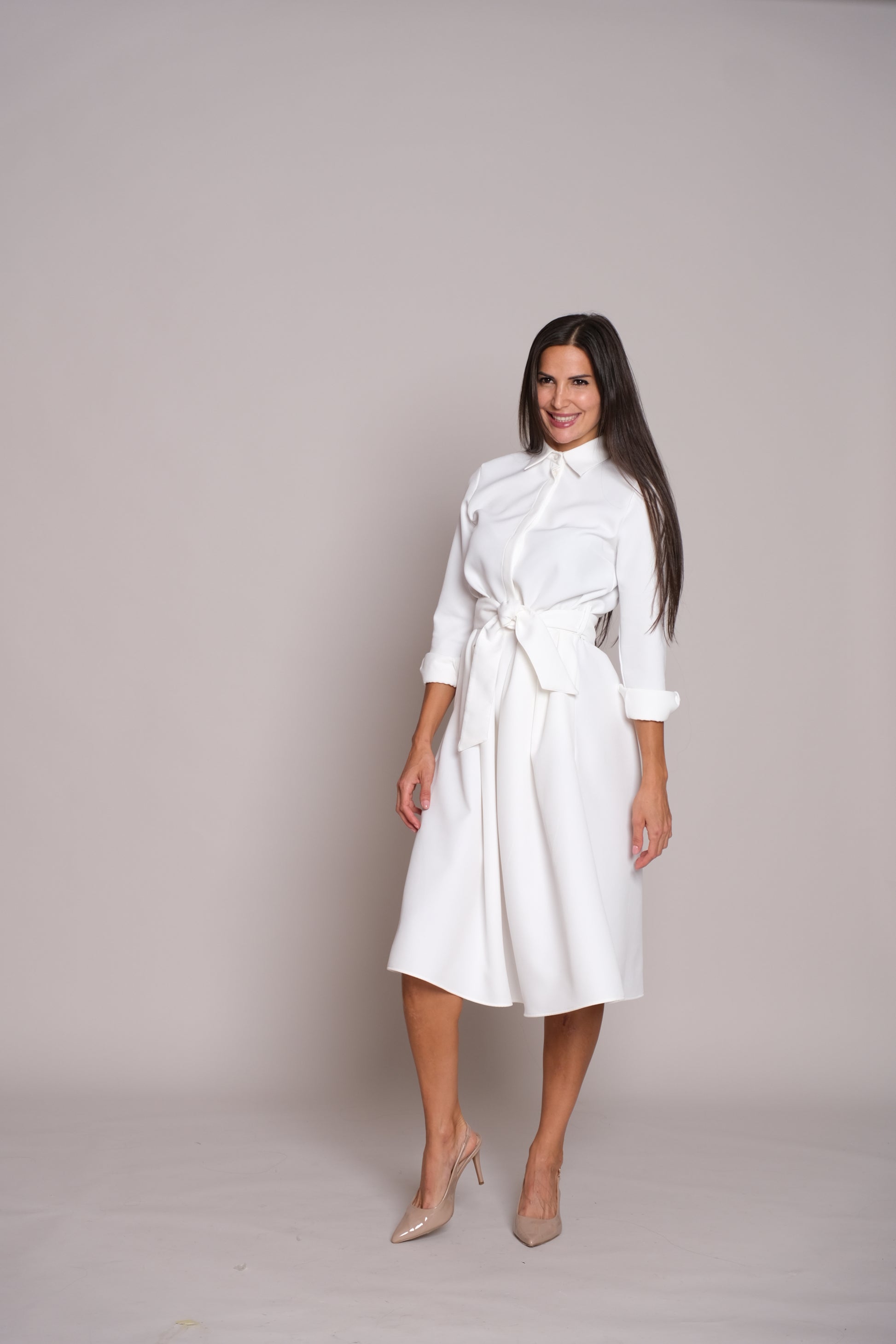 Elevate your style with the Aveline Dress White. Falling gracefully below the knee, this design features a refined school collar, front buttons beneath the neckline, and long sleeves finished with buttoned cuffs. A front-tie belt accentuates the waist, adding definition to the classic silhouette. Elegant yet versatile, it transitions effortlessly from day to evening occasions.
