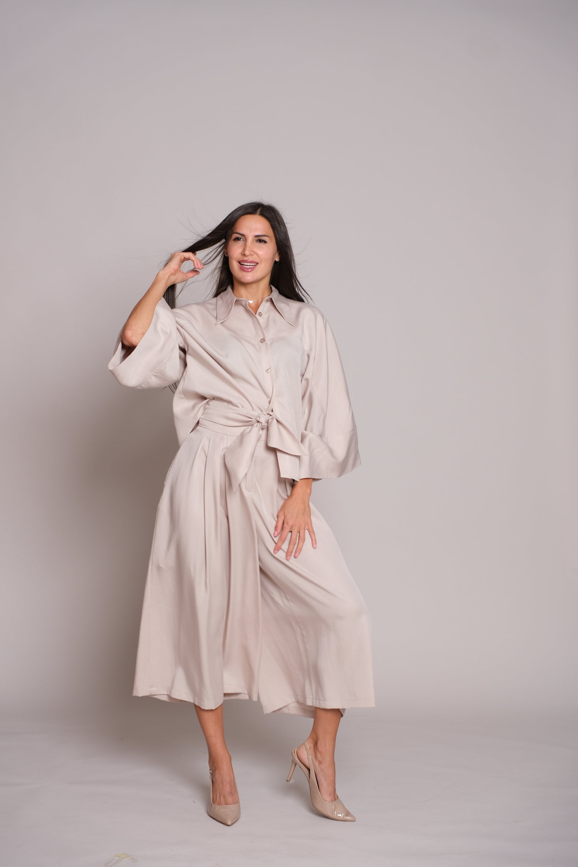 Redefine elegance with the Flair Trousers Beige. Featuring a high-waist design and wide-leg silhouette, they are crafted in a culottes-inspired style, giving the graceful look of a skirt with the comfort of trousers. The soft beige tone makes them endlessly versatile – perfect for office chic, weekend outings, or sophisticated evenings.