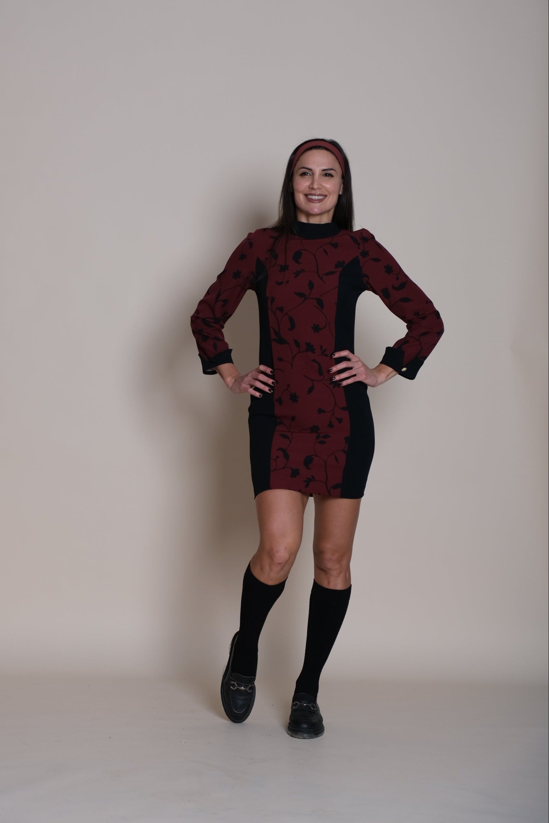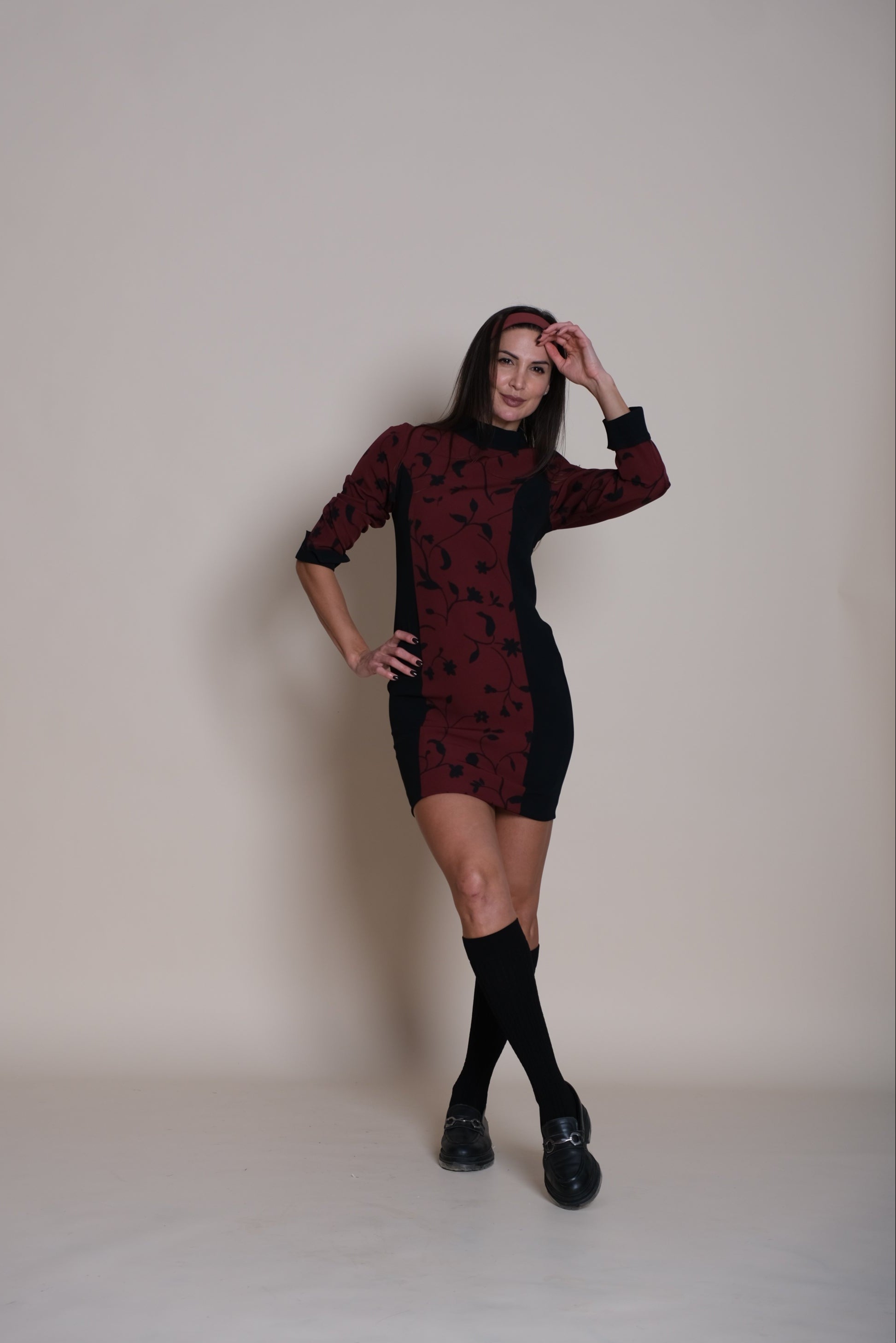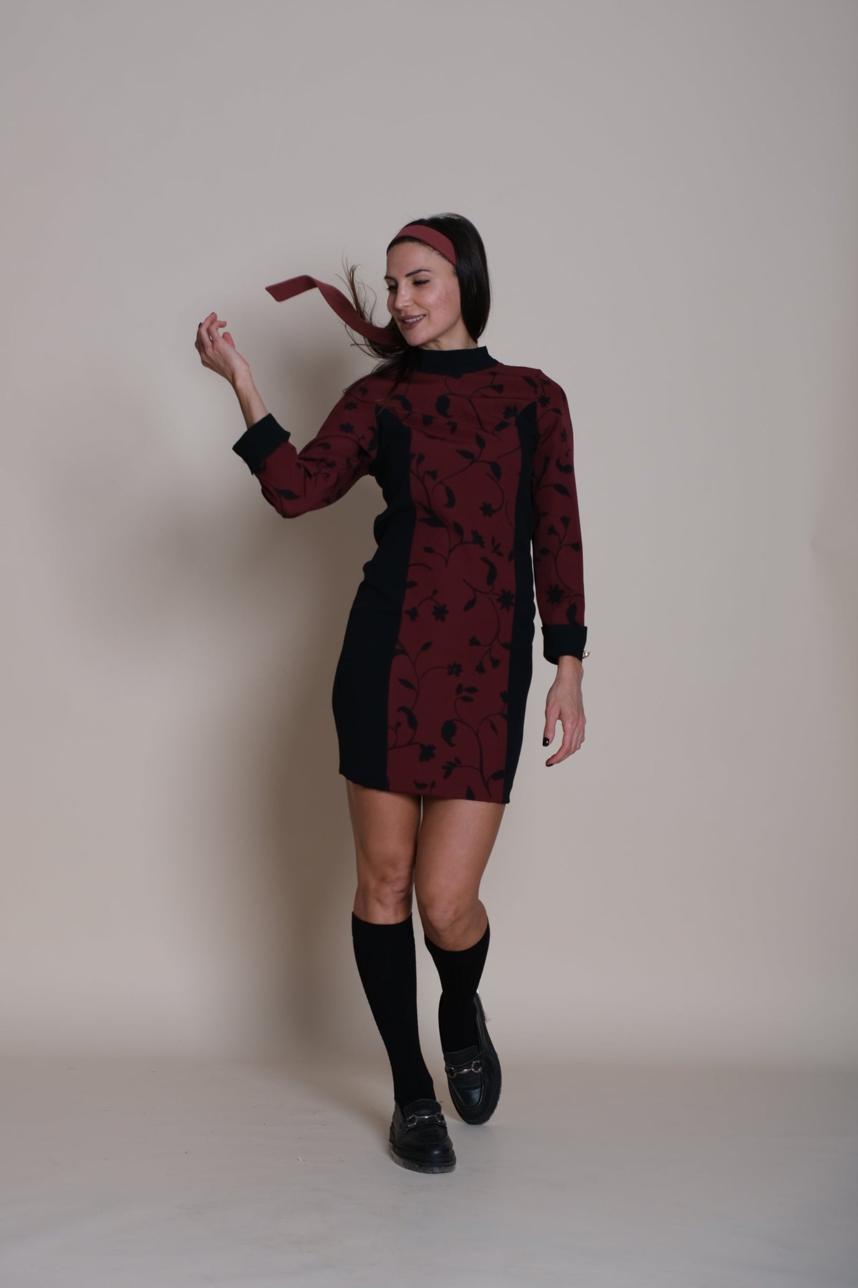 Embrace sophisticated contour and autumnal elegance with the Aura Dress Burgundy. Crafted from a fine, substantial fabric in a rich, dark red Burgundy color, this dress is adorned with a delicate print of black autumn leaves, making it a truly refined statement piece.