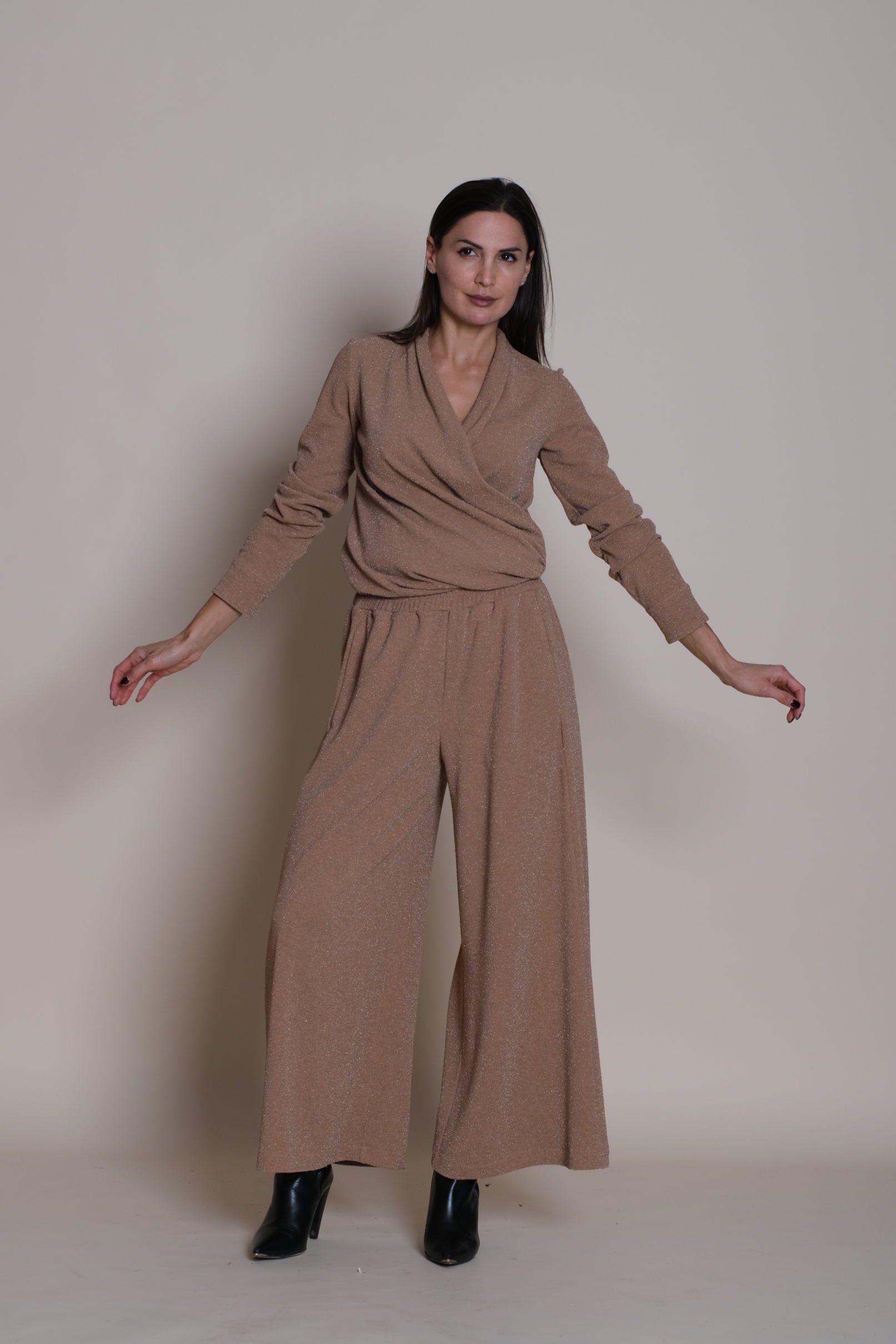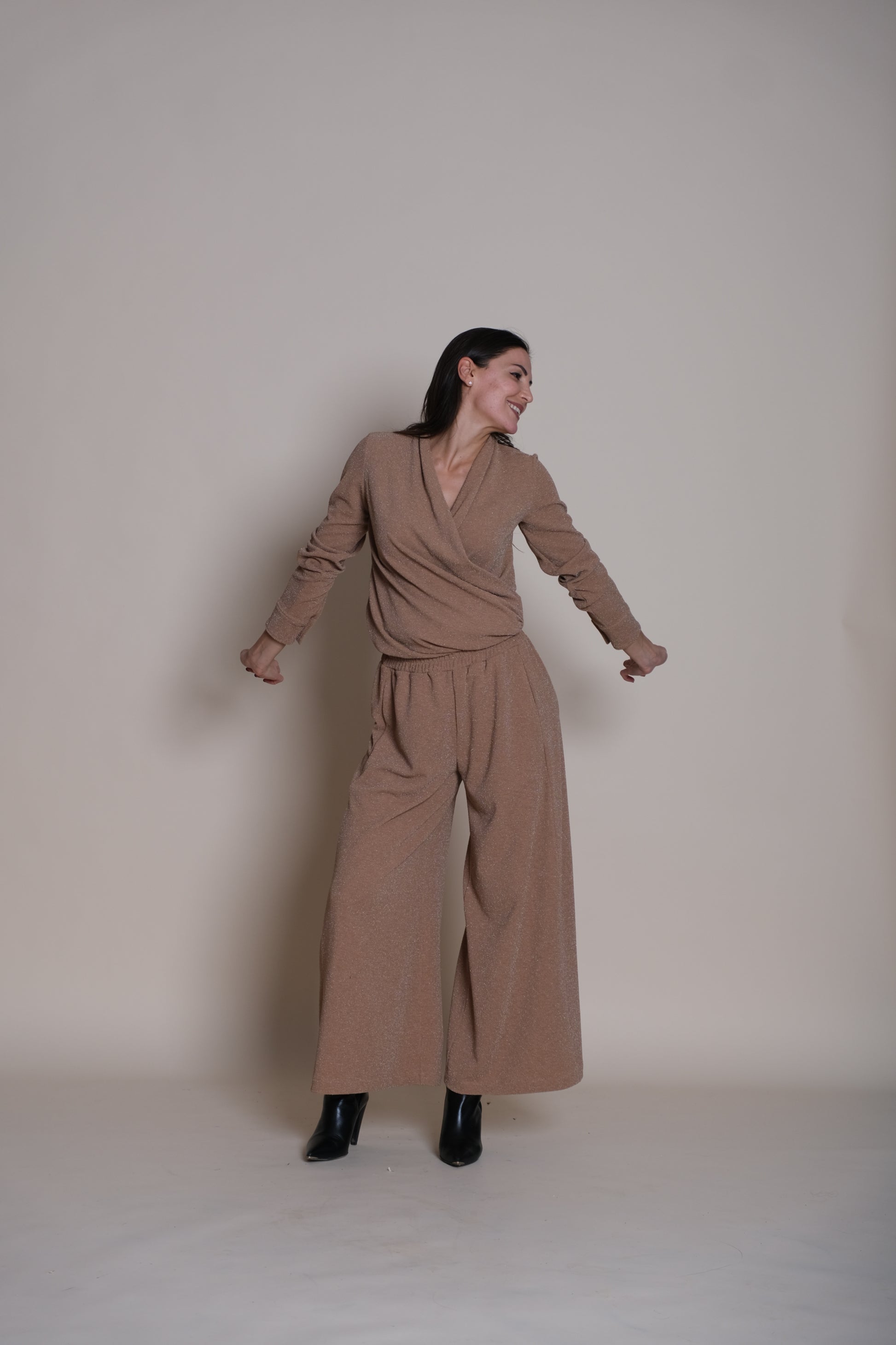 Infuse dynamic brilliance into your wardrobe with the Lumina Hug Beige. Crafted from the same luxurious, soft-touch fabric as the Lumina Trousers, this top provides easy comfort while designed to sculpt and flatter your figure through its adjustable design. The material is treated to deliver a beautiful, subtle sheen that catches the light without being overpowering, giving this top an instantly refined and sophisticated foundation.