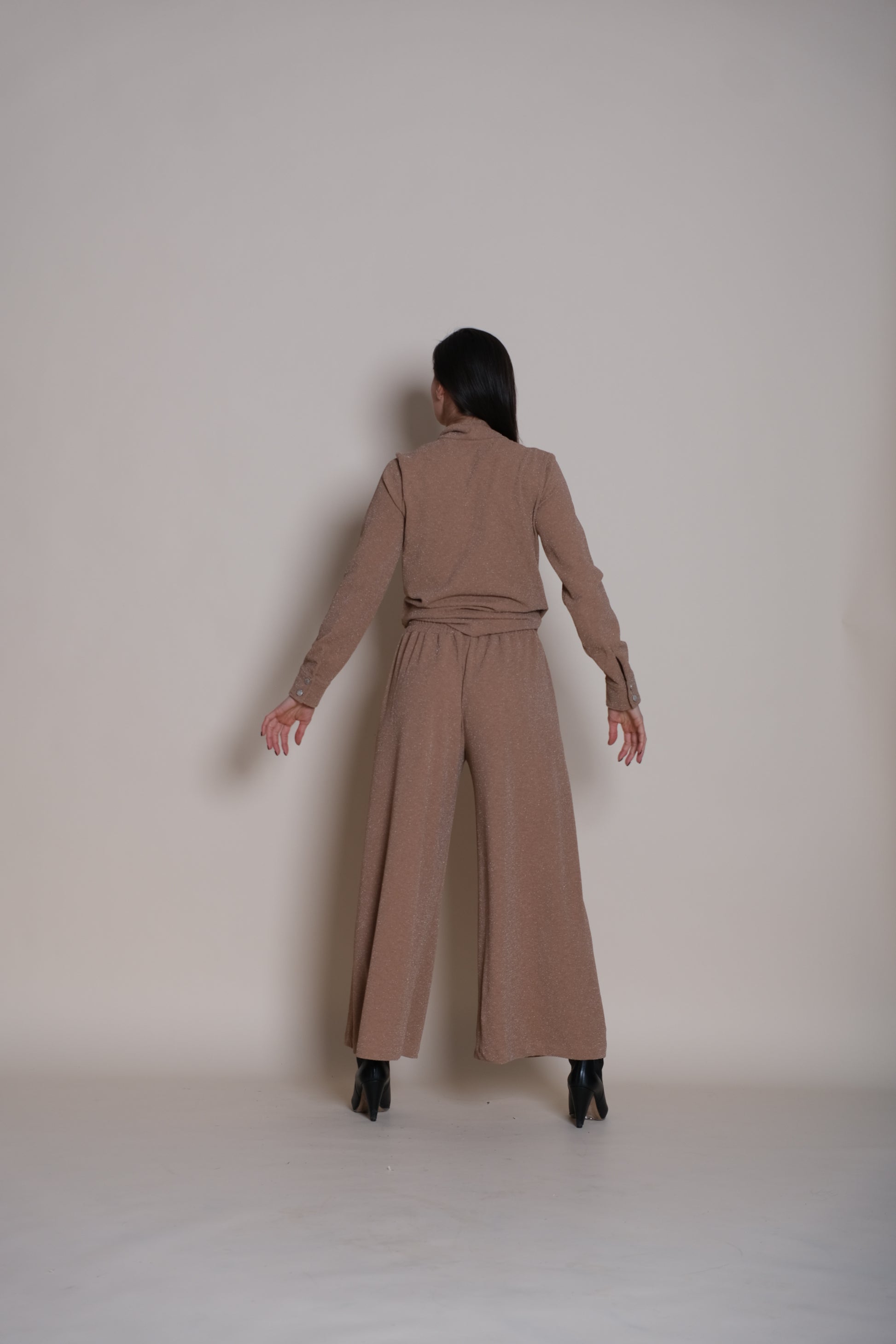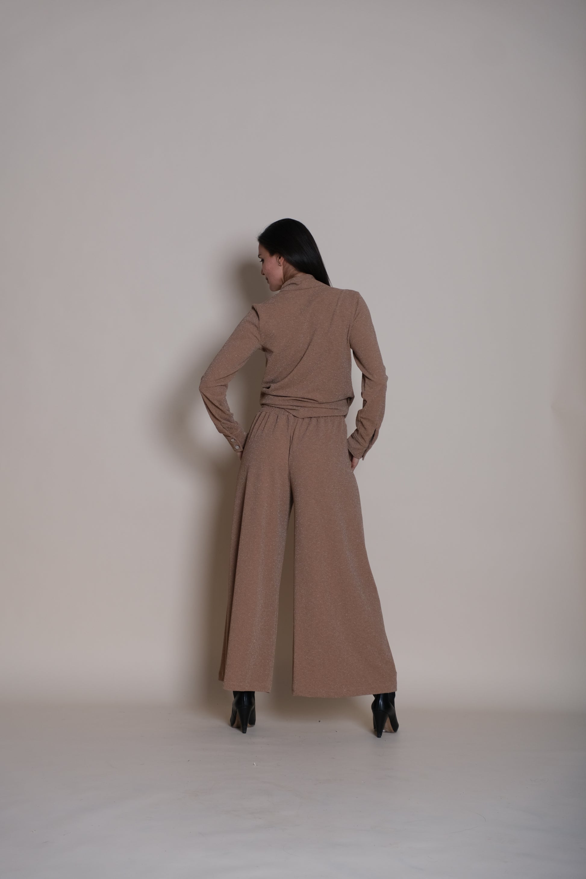 The wide-leg cut ensures the fabric flows beautifully from the sleek, high-waisted fit, delivering a dramatic, sweeping silhouette that offers maximum comfort and sophisticated movement. The design features a smooth, clean-front waistband with hidden elastic for an effortless pull-on fit that stays secure without needing a zipper. Equal parts high glamour and comfortable flow, the Lumina Trousers Beige are perfect for making an unforgettable entrance, whether paired with a simple silk camisole or a sharp blazer. They don't just shine—they redefine sophisticated statement dressing.