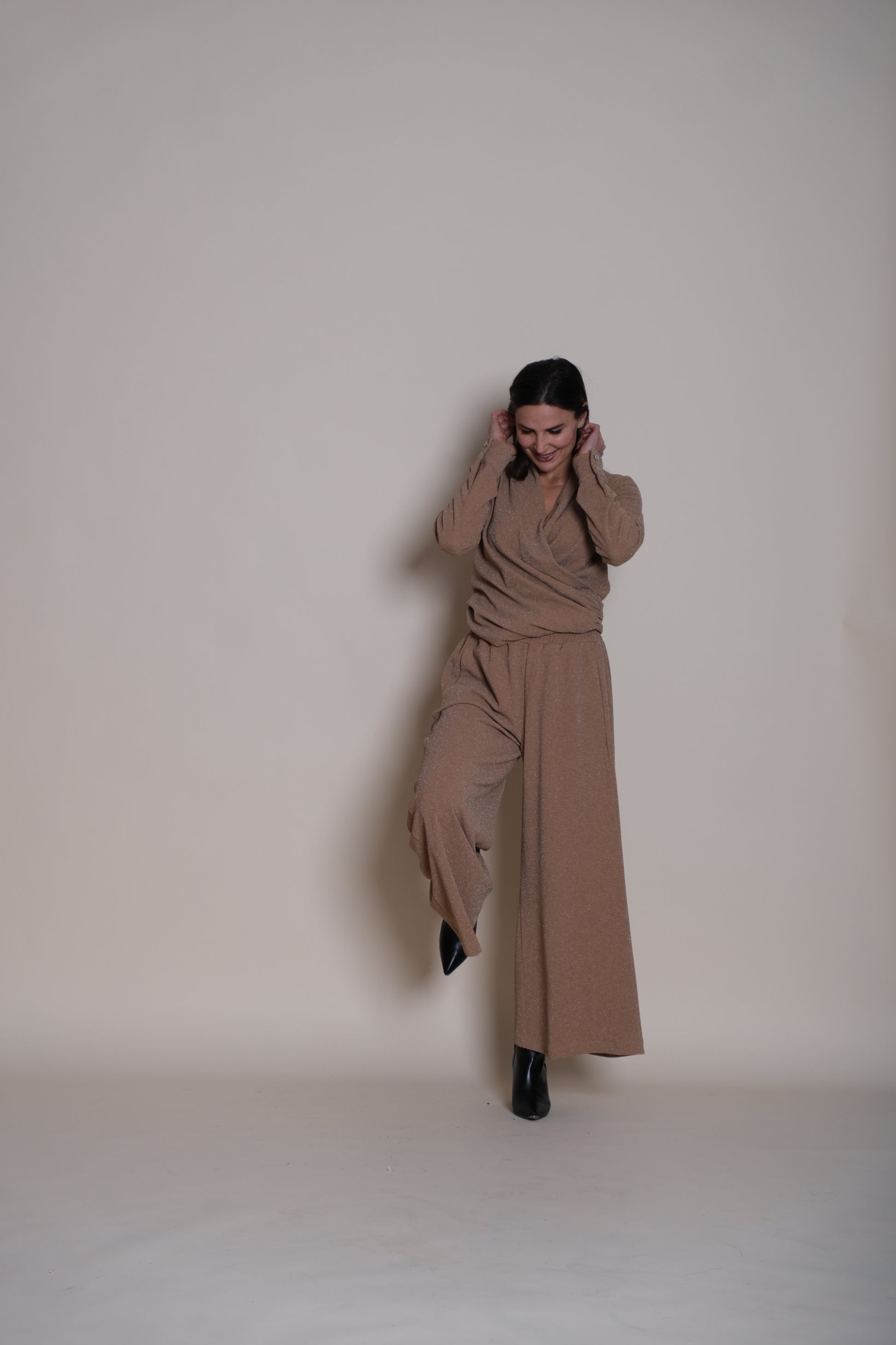 Command the room with the Lumina Trousers Beige, designed for brilliant style and luxurious comfort that you can simply pull on and go. These trousers are crafted from an exclusive, luxurious fabric that feels wonderfully soft and convenient against the skin. The material is treated to deliver an impressive sheen and sparkle that catches the light with every move—it’s dazzling, yes, but perfectly balanced to shine without being too much.