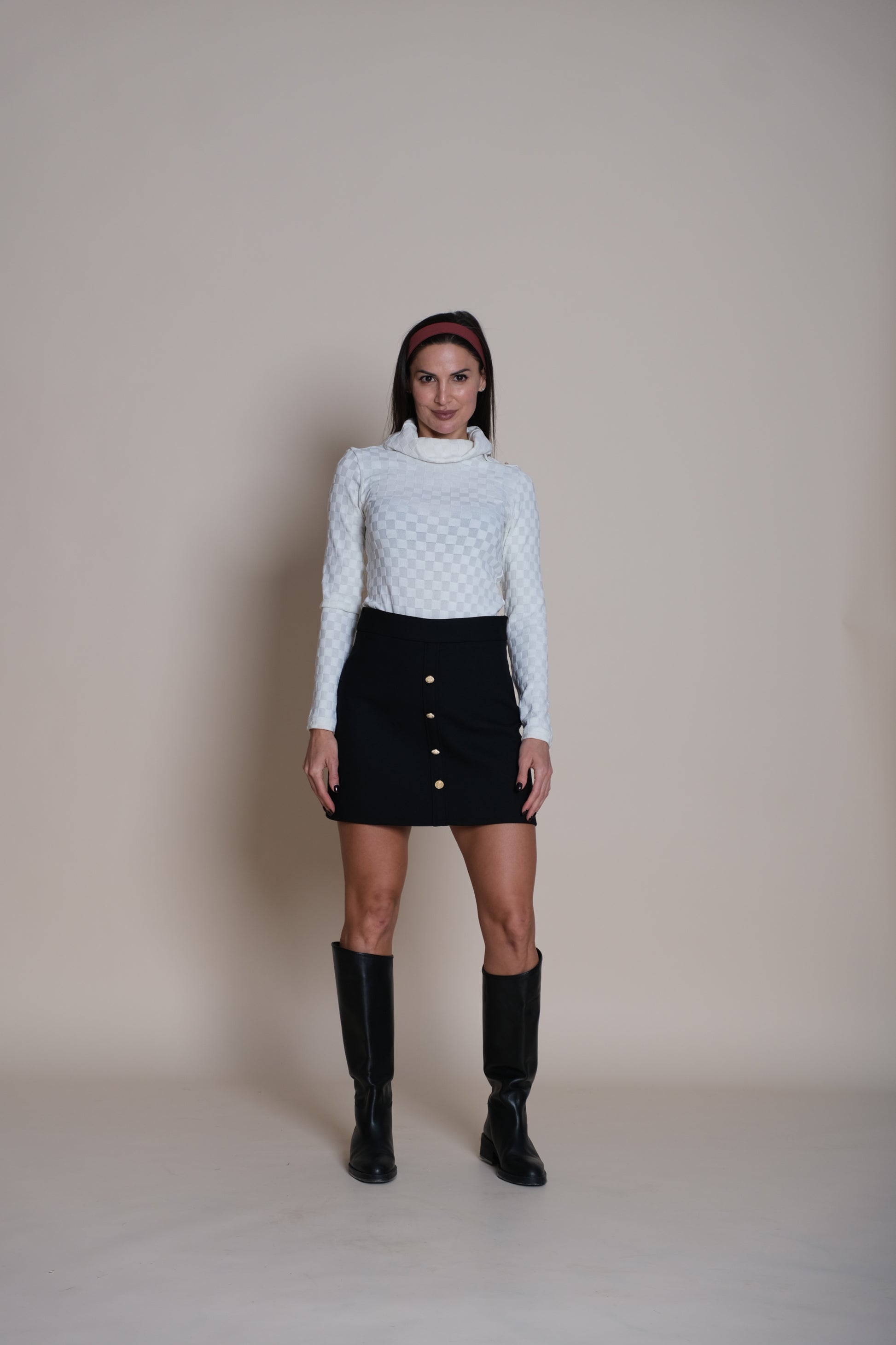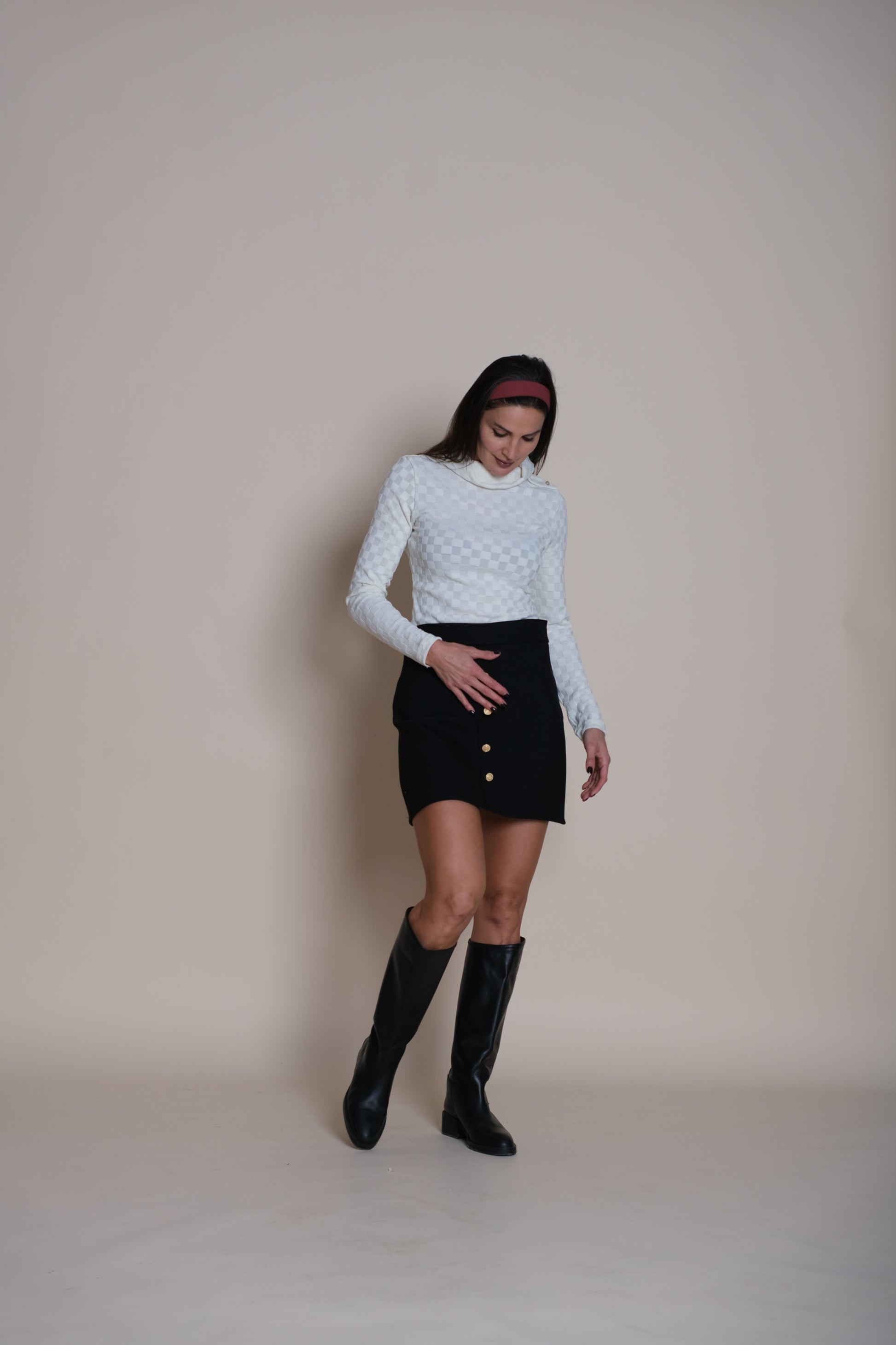 The classic straight-cut silhouette ensures a timeless, flattering fit, while the above-the-knee length keeps the look modern and dynamic. A striking line of statement buttons runs down the center front, providing a chic focal point. Pair this skirt with tights and boots for an elevated cold-weather look, or style it with a tucked blouse for sharp office attire.