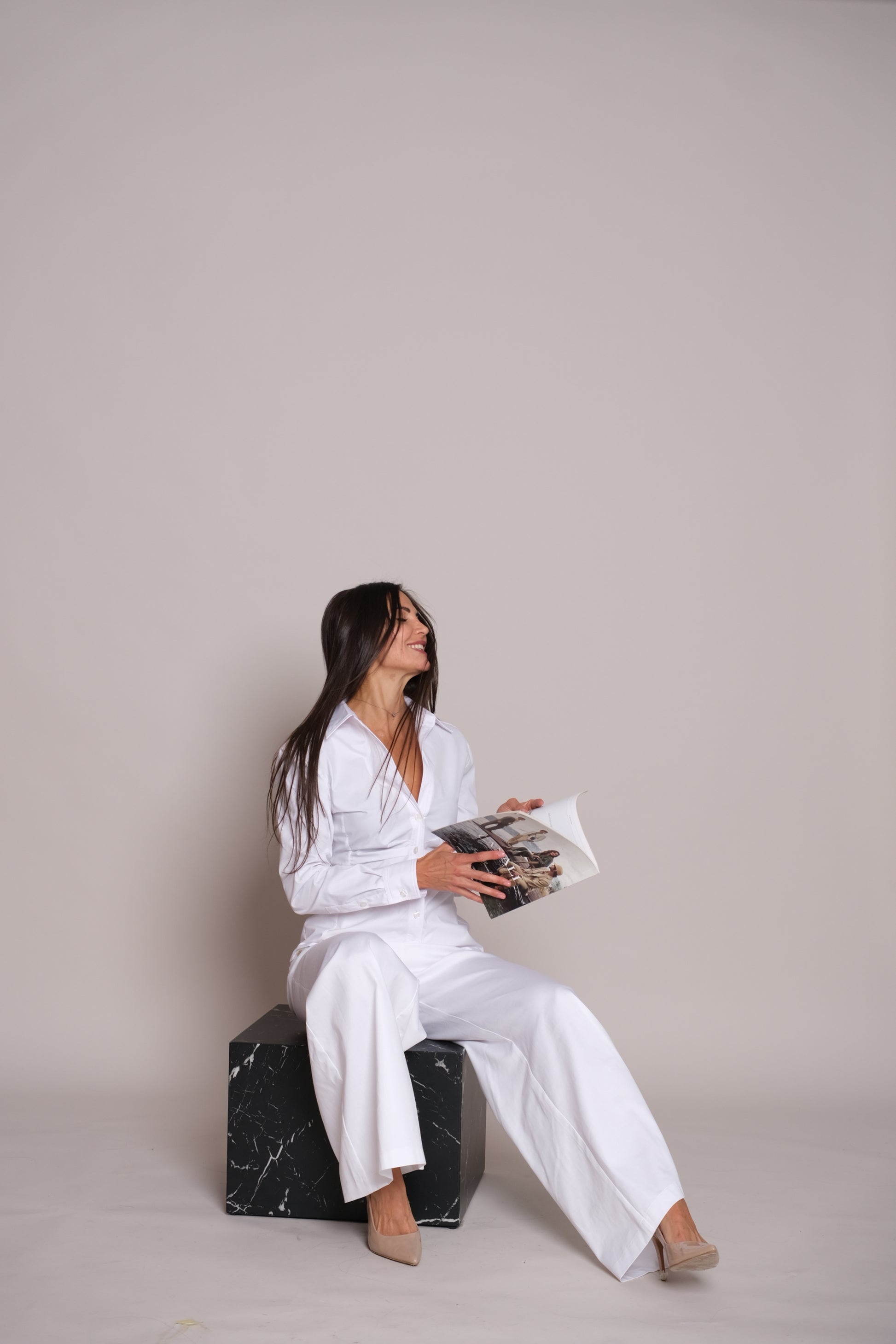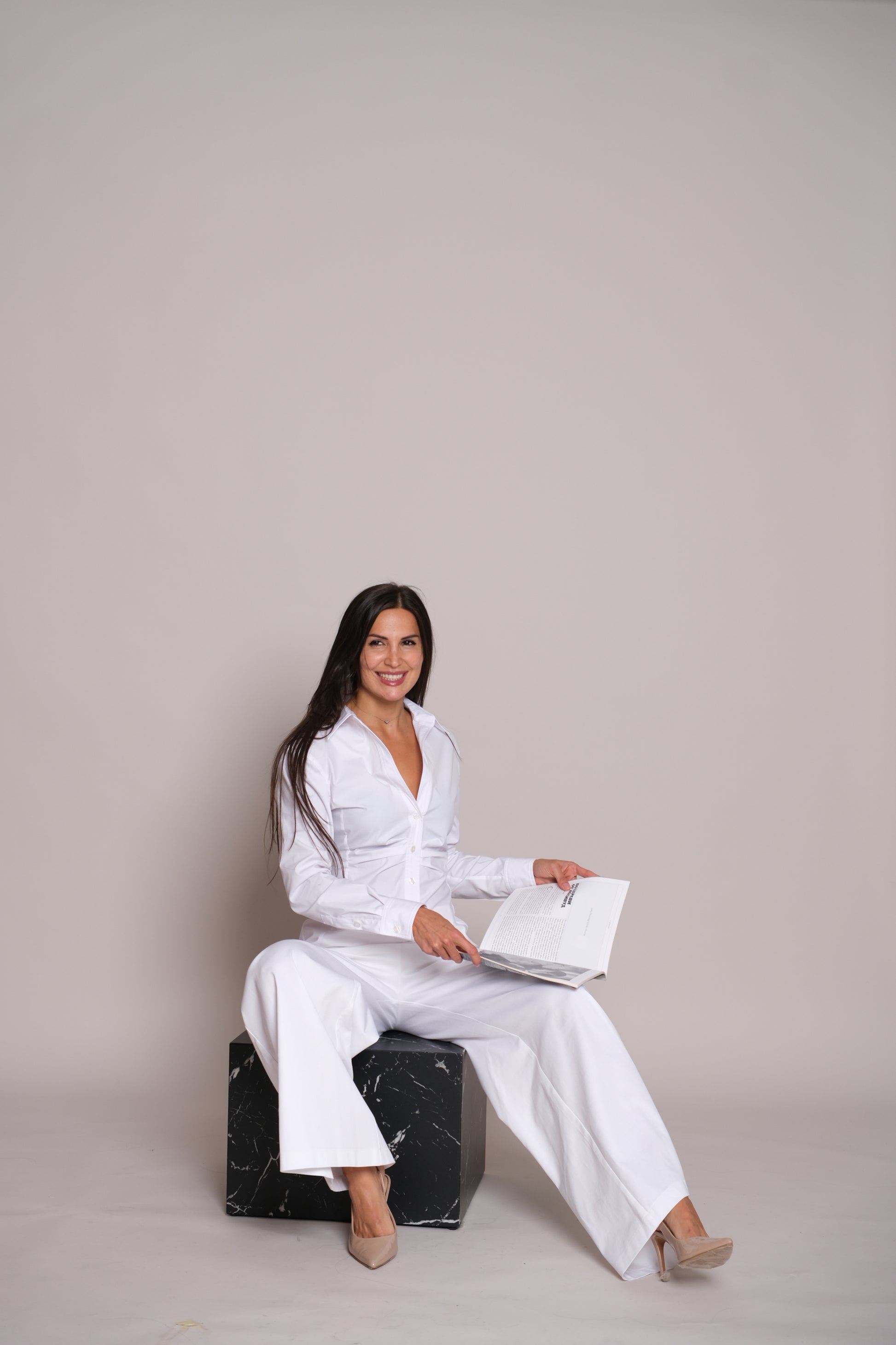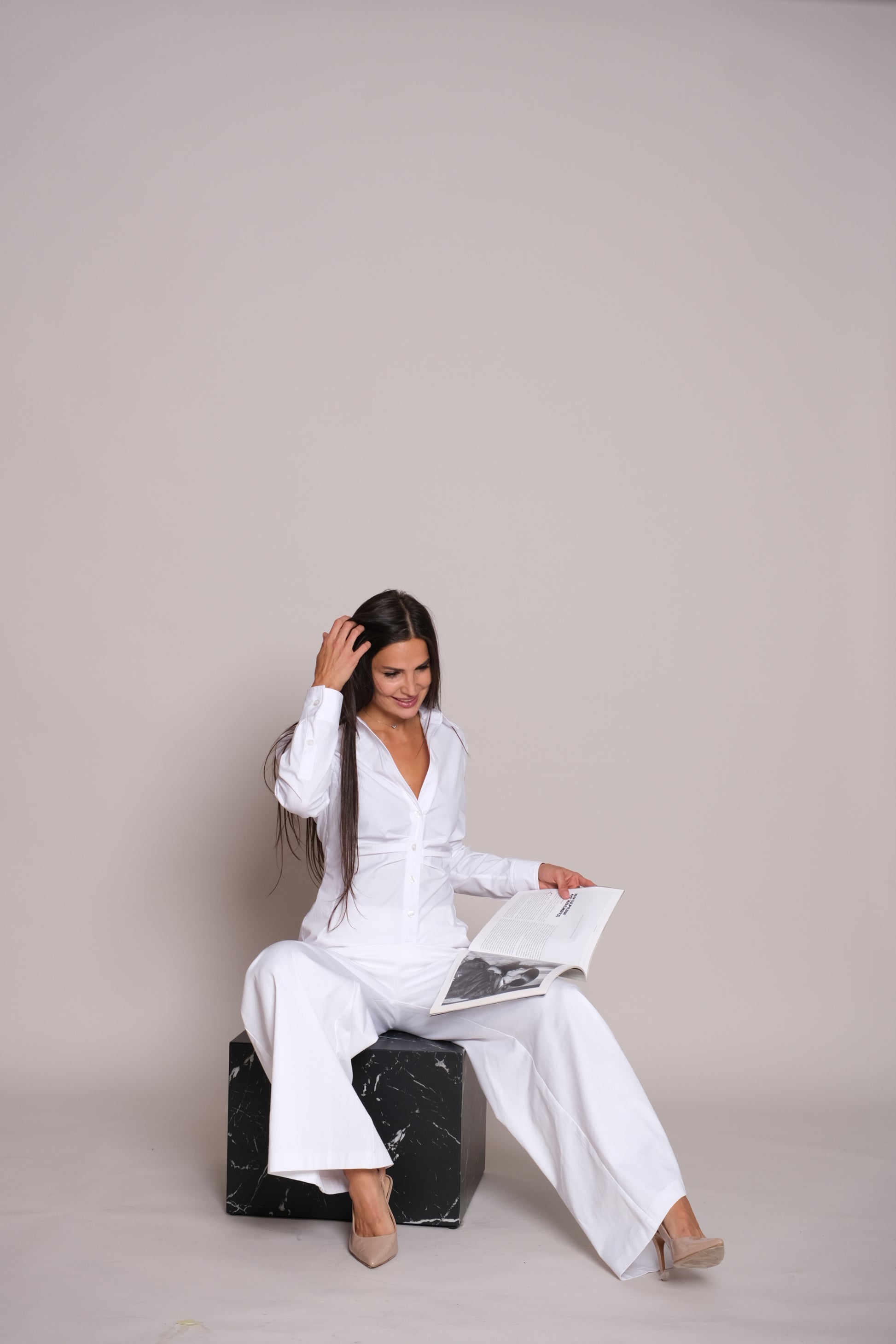 Elevate your wardrobe with the timeless elegance of the Sun Shirt White. Tailored in pristine white, it features a refined V-shaped neckline that elongates the silhouette and adds a touch of sophistication. The cinched waist creates a flattering, feminine shape, balancing sharp tailoring with graceful lines. Effortlessly chic and endlessly versatile, this shirt transitions seamlessly from power dressing to evening elegance.